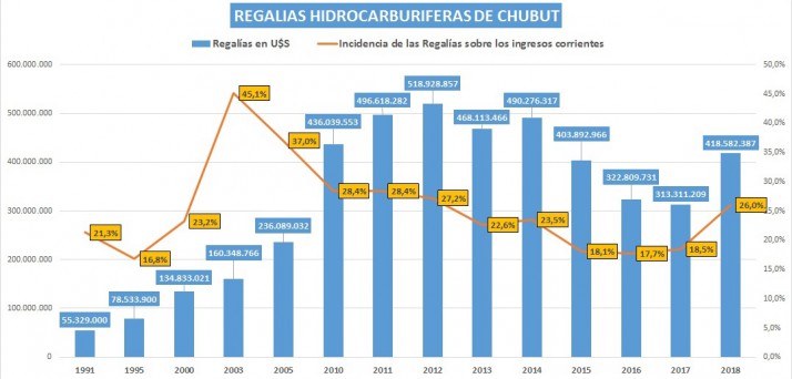 De la extracción de petróleo y gas surgen las regalías provinciales, que están directamente vinculadas a los niveles de producción ya que en función de esas fluctuaciones aumentan o decrecen los ingresos provinciales por este concepto fundamental de las arcas públicas chubutenses.