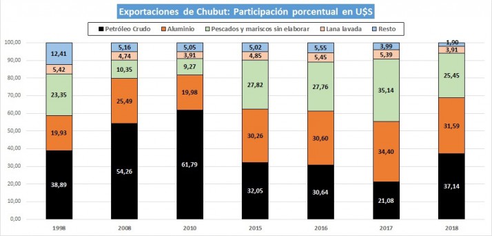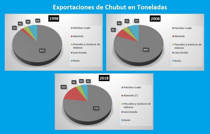 Esa tendencia de concentración de las materias primas exportadas es una constante en los últimos 20 años, aunque en 1998 entre el sector petrolero, los pescados sin elaborar y el aluminio agrupaban 82%; mientras que los demás el restante 18%. Desde 2008 los demás sectores exportadores apenas concentraron el 10% y el año pasado se redujeron a su mínima expresión y representaron solamente 5,8% del total vendido al extranjero desde Chubut.